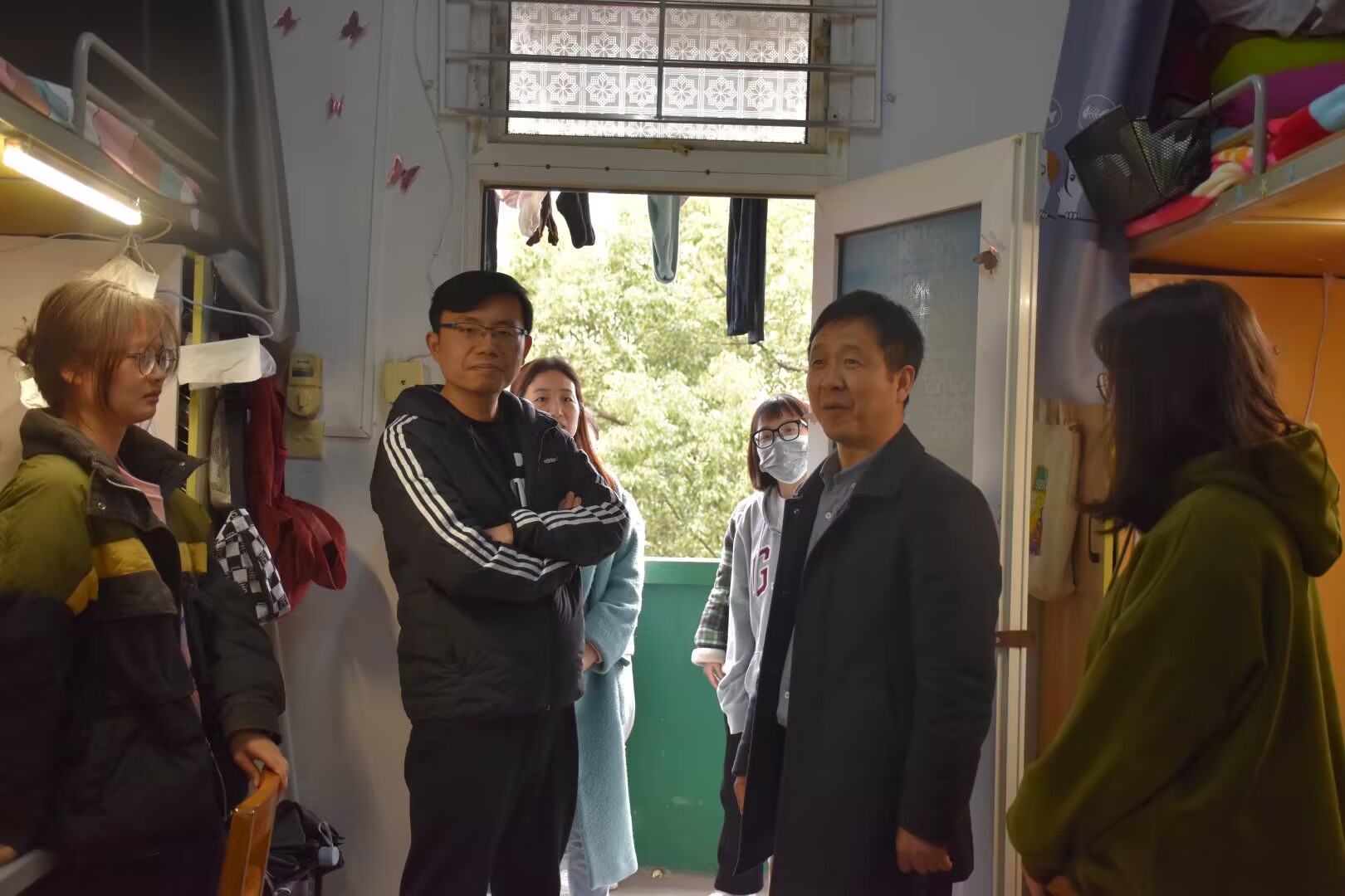 为进一步加强学生宿舍安全管理,深入了解学生思想、生活及学习情况,为新学期营造良好学习生活环境,3月1日下午,william威廉中文党委书记杨期勇,党委副书记张杨帆,学生管理科科长龚双双,学生教育思政科科长肖国光一行对我院学生宿舍进行走访排查。