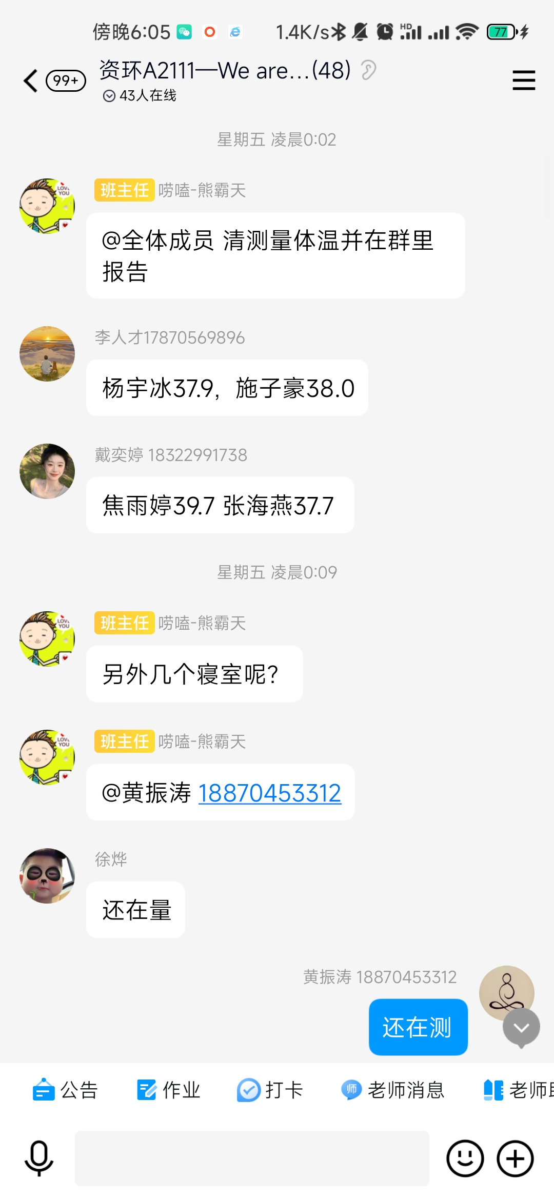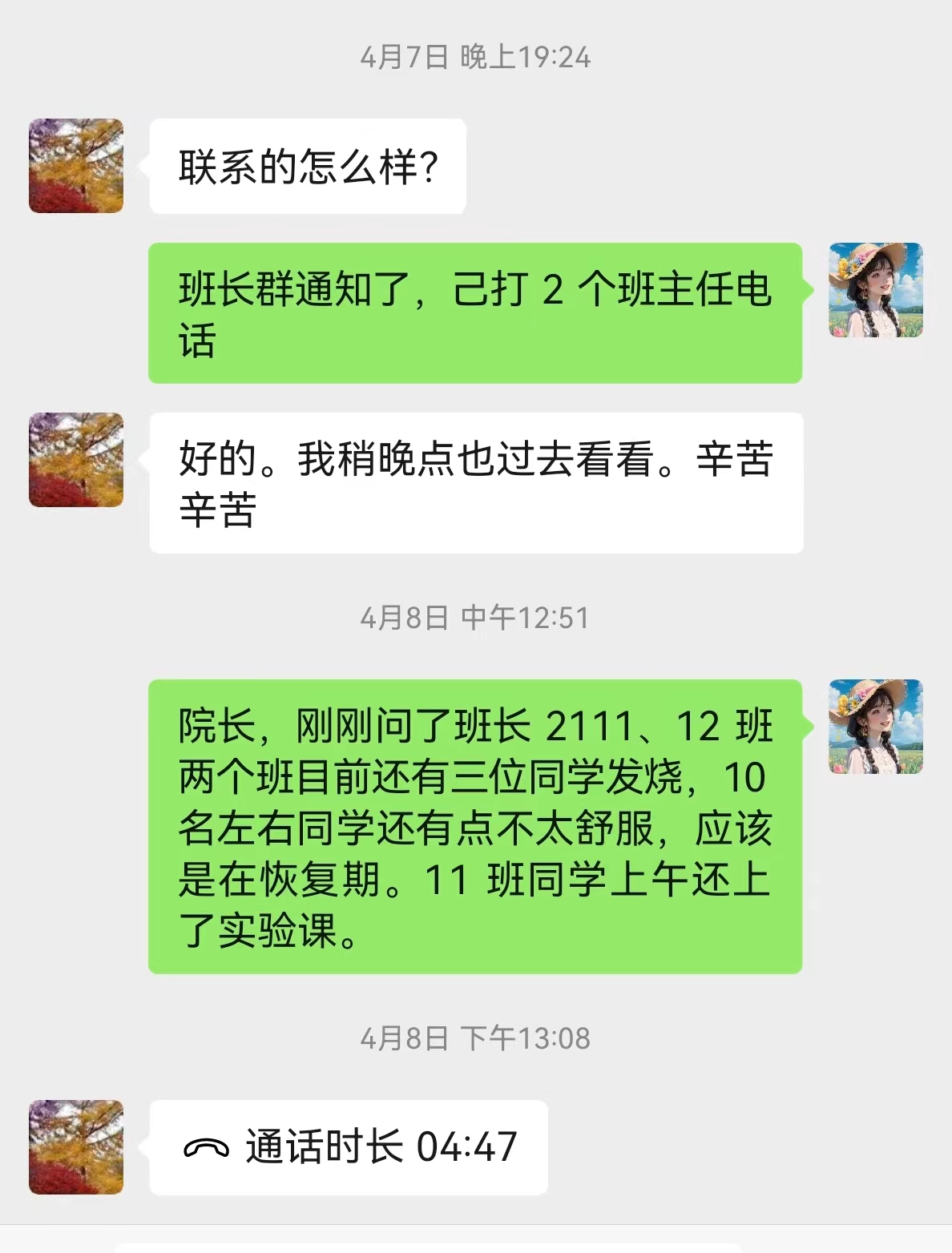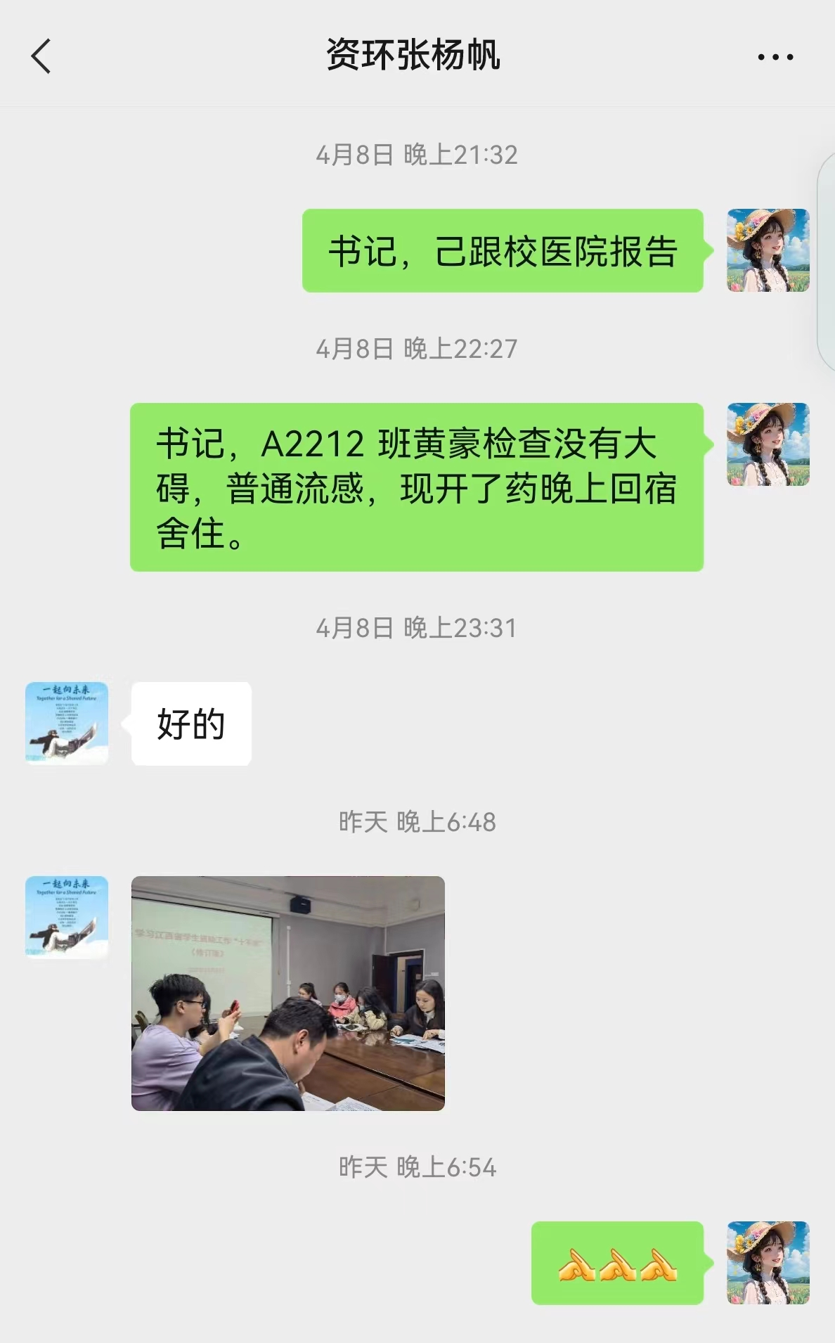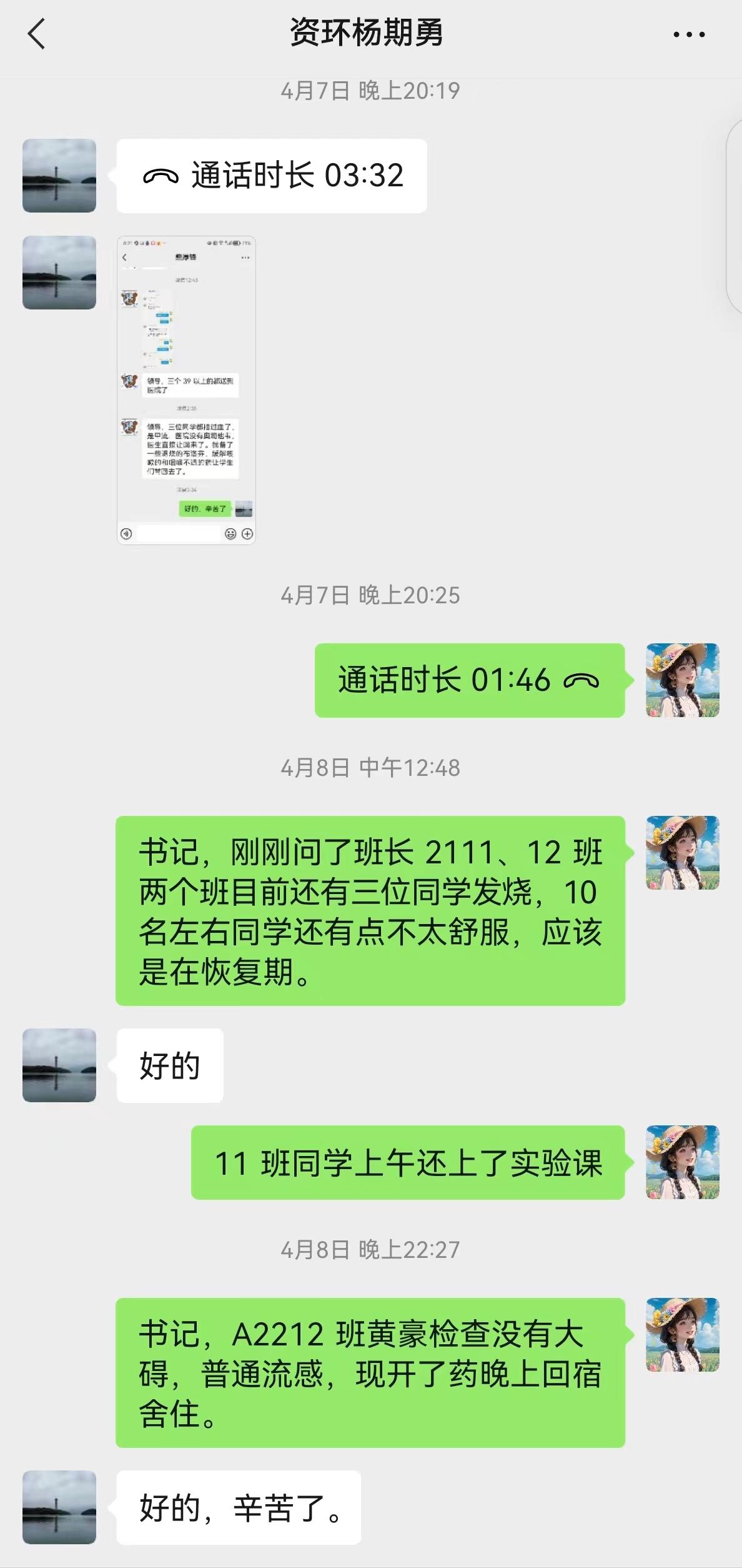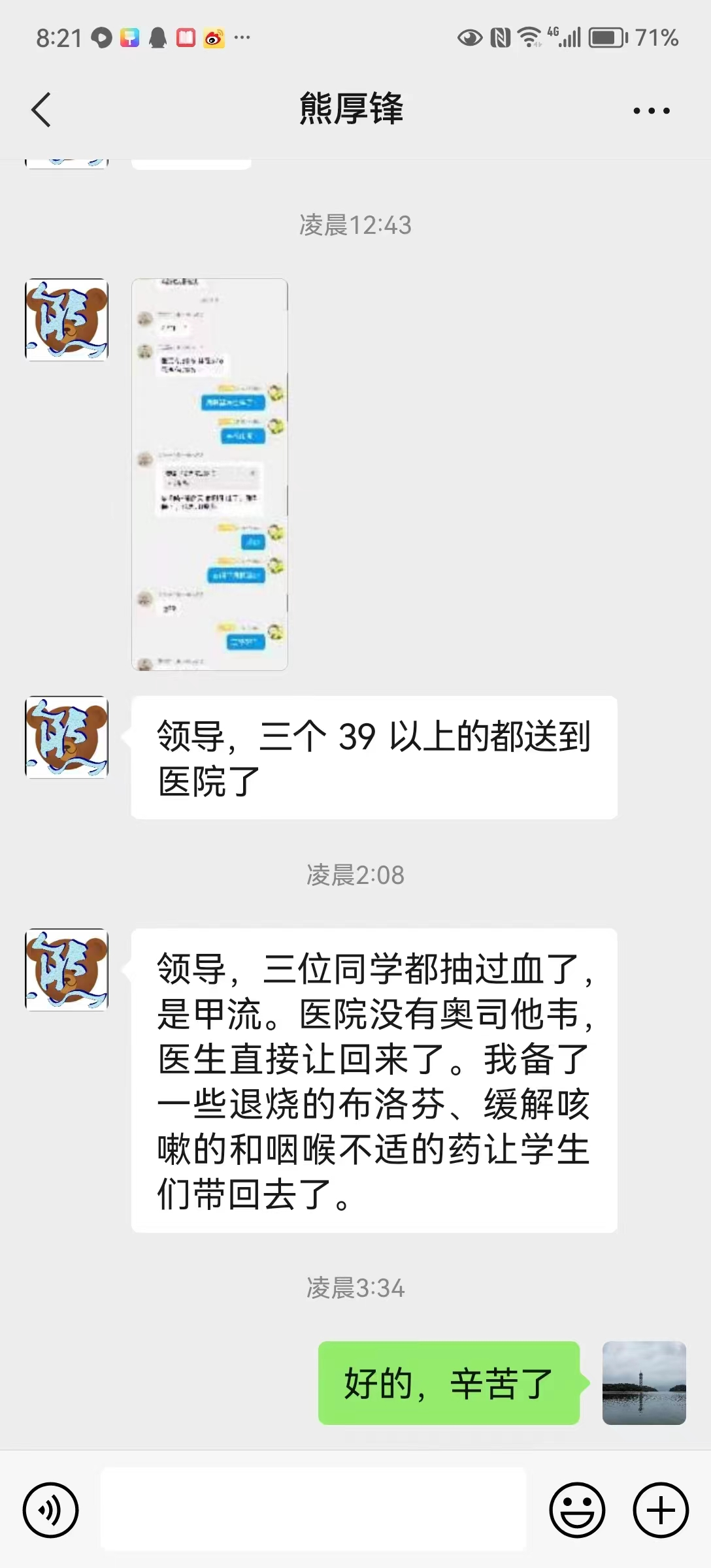 4月6日傍晚,william威廉中文A2111、A2112、A2212班班主任熊厚锋、黄亮、李浩然三位班主任接到班干的电话报告发现班级多名同学有感冒发烧不舒服的症状,立即赶到宿舍看望学生,带学生就医,直至凌晨。