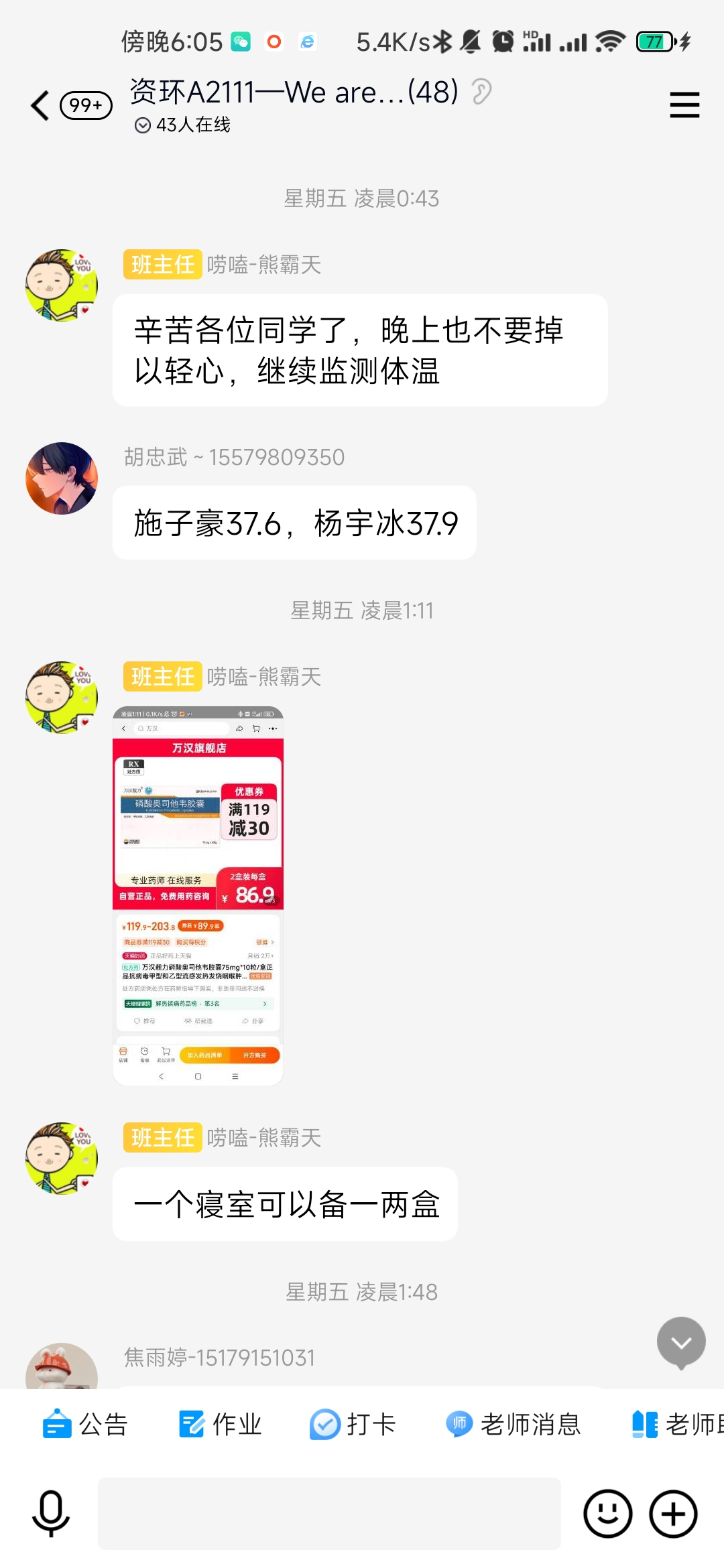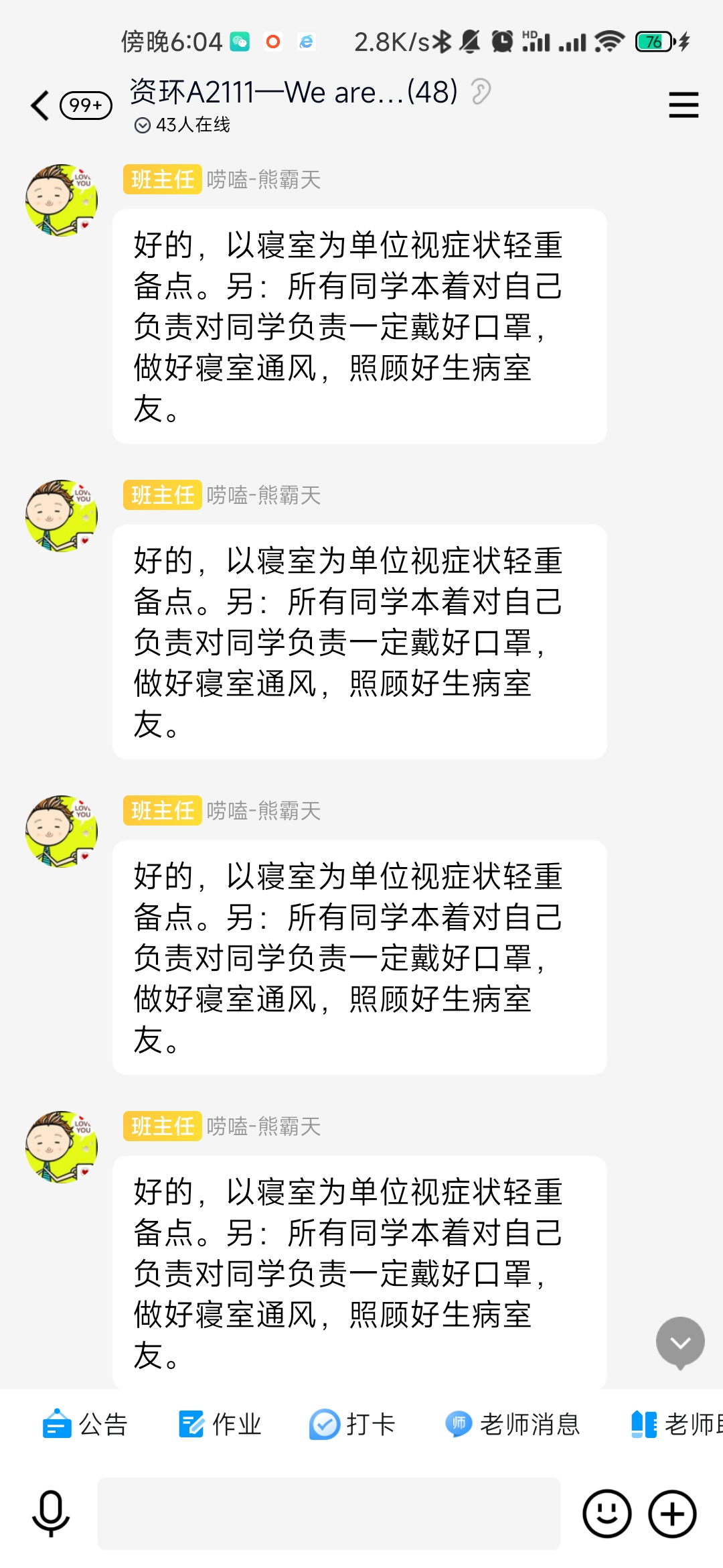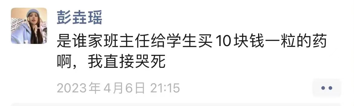 4月6日傍晚,班主任黄亮老师接到班干电话,报告班上发现有多名同学出现感冒发烧、喉咙痛,浑身无力等症状,接完电话黄亮老师立即放下碗筷,驱车到药店买药,由于正值流感高发季节,抗流感药物非常紧缺,班主任跑了好几家药店才买齐了布洛芬、感冒和专门的抗流感等针对性的药物送到学生宿舍,为学生送去了温暖和关爱。