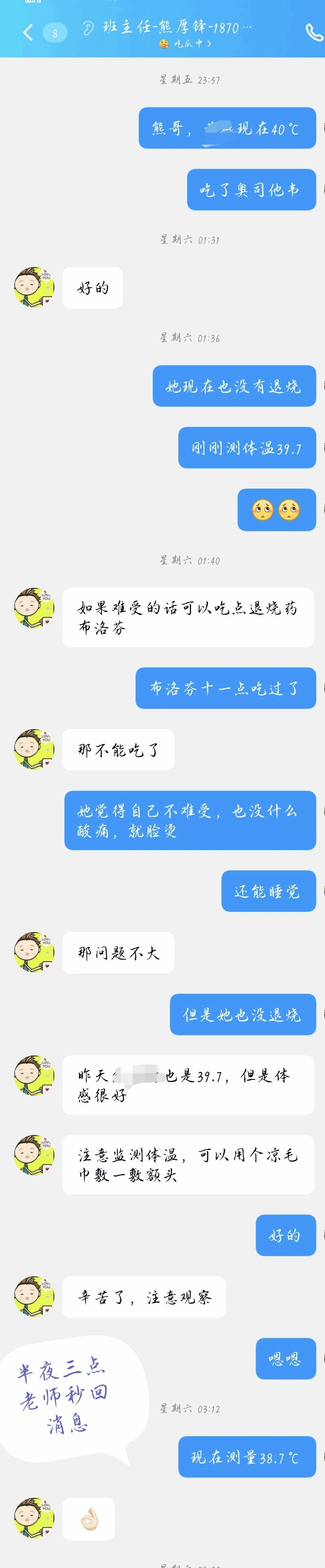 4月7日凌晨。一阵急促的手机铃声、短信将正在睡梦中的班主任熊厚锋惊醒,打来电话、发来信息的是熊厚锋老师所带班级的班干,发现班上有3名同学高烧39.7℃、39.3℃、39.2℃,一听有学生生病,熊厚锋老师赶紧穿上衣服跑了出去,紧急将发高烧的同学送去就医,并为其垫付医药费,直至凌晨3点才回,让学生十分感动。