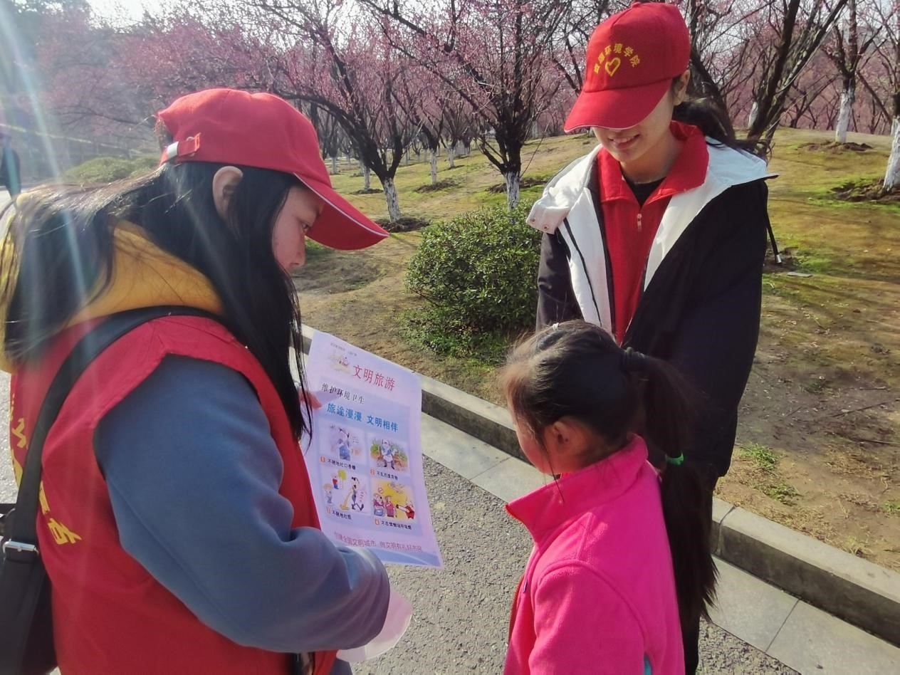 志愿者们向游客发放"文明旅游"相关材料,耐心地向游客讲解文明旅游知识,积极教育引导广大市民群众健康旅游、文明旅游、安全旅游,强化文明意识、遵守文明公约、培树文明习惯受到广大游人的欢迎和好评。