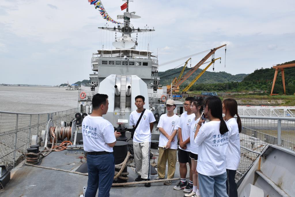 为进一步弘扬爱国主义精神,增强国防观念,“红色走读”实践团队走进位于九江市湖口县的九江舰爱国主义教育基地,近距离学习九江舰的辉煌历史和战斗精神,感受我国海军的发展历程以及海军实力的日益强大,激发青年学子们强烈的爱国情怀。同学们参观学习了“九江舰”的服役历史、火力配备及战略地位等内容,对“九江舰”多次在全军、海军、舰队组织的重大演习及海上巡逻、护渔护航等急难险重战备任务中屡建功勋,倍感光荣与自豪。在看到会议室墙壁上贴满了奖状和悬挂着伟人的题词,激励战士们勇往直前,也激发了同学们的爱国报国军人梦。