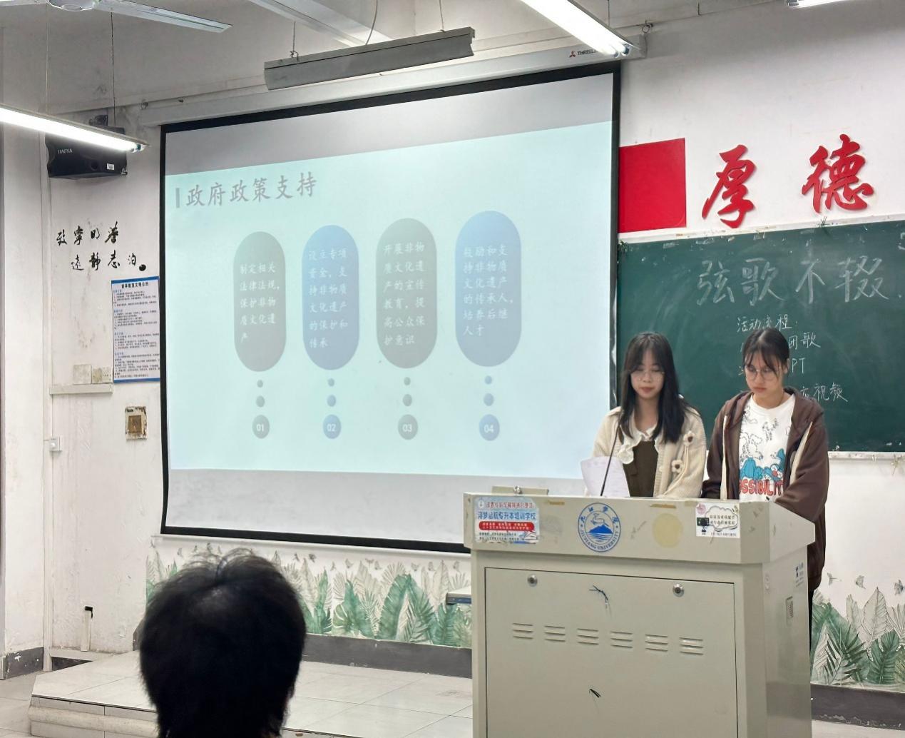 此次活动中,各团支部组织本支部团员与青年对我校校歌的由来和内容进行资料搜集整理,重点学习讨论校歌所传递的精神力量,并在团日活动中进行分析讨论与交流心得。同时通过PPT讲解的方式让同学们进一步了解非遗文化。