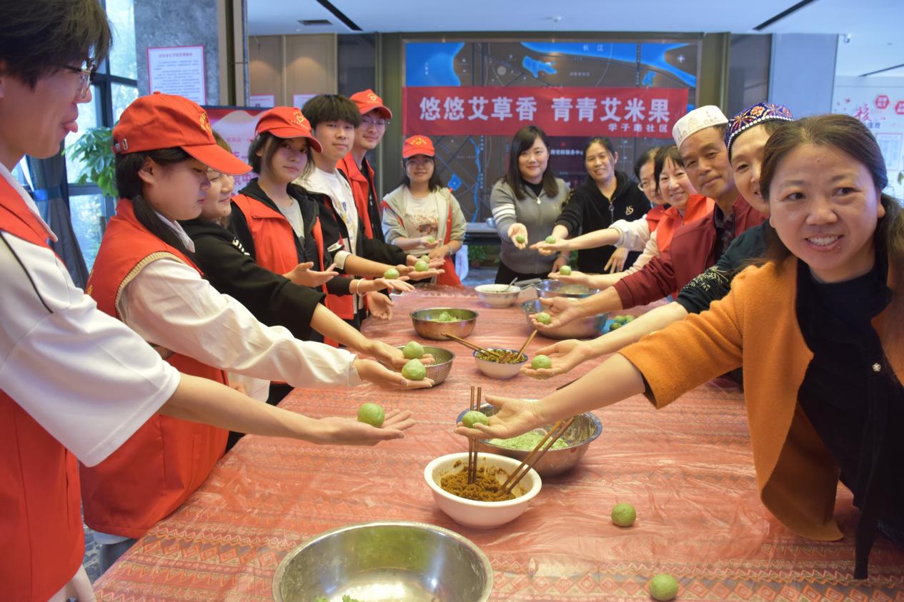 在社区工作者的带领下,志愿者们开始协助制作艾米果。“捣艾草为汁,和粉做团,色如碧玉”,把悠悠艾香揉进面团里。大家将面团分成小块,用手掌压成薄饼状或捏成碗状,然后包入花生、芝麻、白糖等馅料,轻轻捏、慢慢揉,做成一个个扁的、圆的、椭圆的、尖嘴的、花瓣型的......同学们想象力无限,做出了各种各样形状的艾米果。活动现场气氛热烈,欢声笑语,其乐融融。大家在轻松愉快的氛围里感受中华传统节日和传统美食的魅力。