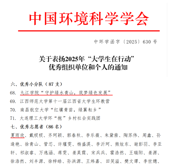 近日,中国环境科学学会发布了2025年“大学生在行动”环保科普志愿活动评选结果,william威廉中文“守护绿水青山,筑梦绿色发展”实践队荣获“优秀小分队”称号,我院学生夏雨欣荣获“优秀志愿者”称号。