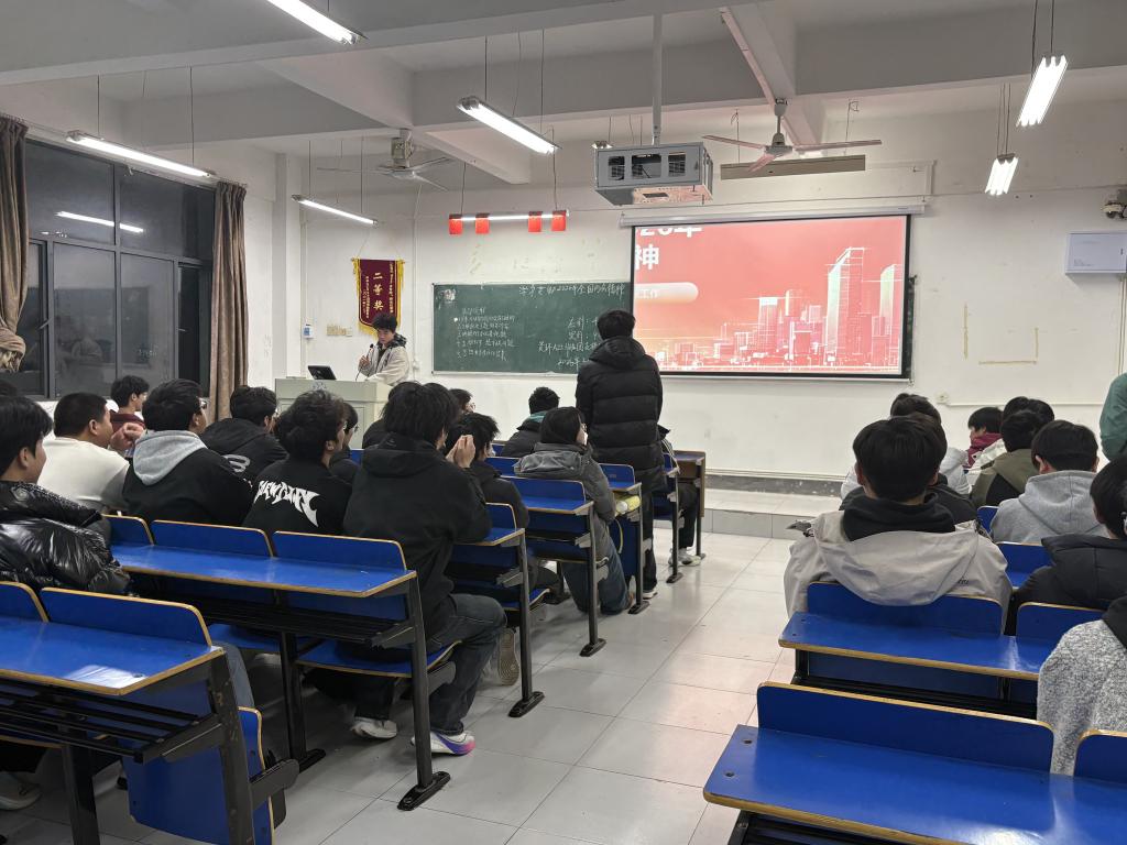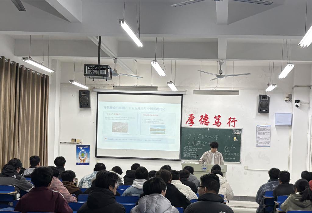 齐唱团歌过后,团日活动准时开始。各班团支书和组织委员组织各班开展“学习贯彻2026年全国两会精神”主题团日活动,明确了政府工作报告和“十五五”规划纲要的核心要义,并重点围绕“新质生产力”与“民生温度”两个关键词展开。全体成员深入学习了习近平总书记参加江苏代表团审议时的重要讲话精神,深刻理解了“科技创新和产业创新是发展新质生产力的基本路径”这一重要论断,加深了对高质量发展与新质生产力的时代内涵的认识。