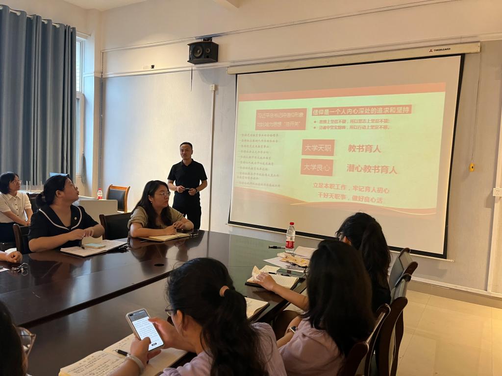 党委书记杨期勇作总结发言,指出学院坚持贯彻落实习近平总书记关于教育的重要论述和教师队伍建设的系列重要指示批示精神,涌现出了一批优秀教师,蒋莹博士主持的课题获批2023年度国家自然科学基金青年科学基金项目,学院学科竞赛取得了新的突破,学院优秀教师、教育工作者、辅导员、班主任均在各自岗位熠熠闪光。杨期勇对学院师德师风建设提出要求,要继续以主题教育为契机,结合学院中心工作,创新工作方式,丰富教育载体,注重建设成效,持续开展师德师风建设,一是要以党建为引领,引导教师争做新时代“四有”好教师;二是以院风建设为抓手,推进师德师风系统化建设;三是以学生为中心,深入推进“三全育人”;四是以目标建设为导向,发挥课程思政辐射作用。