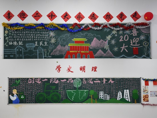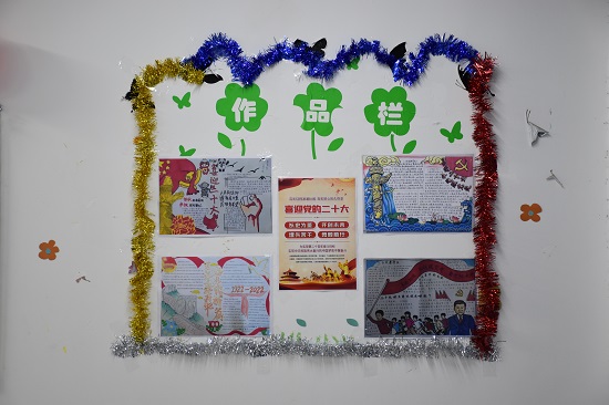 走入教室,主题鲜明的板报、丰富多彩的装饰、极具班级特色的“红色”文化墙映入眼帘,这里教室的每一面墙壁都在“说话”,每一处角落都散发着青年学子浓浓的爱党、爱国气息。同学们根据活动方案积极行动,利用课余时间,围绕主题精心设计、各展其能,大家绘制的各类多彩黑板报、手抄报将党的二十大相关知识渗透在每一笔一画一心中,同学们描绘心中党的风貌,传承红色基因,谱写青春绚丽华章,以实际行动展示青春向党的信念,以饱满的热情迎接党的二十大胜利召开。