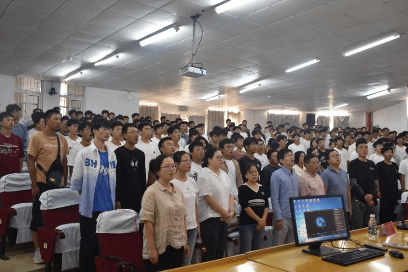 随着一段精心剪辑的“大美军训”视频在会场缓缓播放,镜头中记录了新生们军训期间的汗水与欢笑、坚韧与成长,为大会的开场营造了温馨而鼓舞人心的氛围。紧接着,国歌的雄壮旋律响彻全场,大会正式拉开帷幕,全场肃立,共同表达对祖国的崇高敬意。
